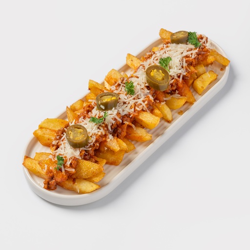 سیب زمینی سرخ شده_سس گوشت چرخ کرده با گوجه پخته شده_فلفل هالوپینو_دیپ پنیر چدار_گوشت چرخ کرده